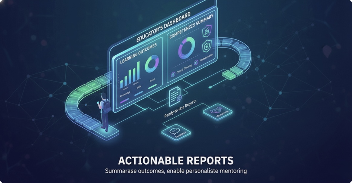 Easy-to-understand dashboards summarise all learning outcomes and competencies. Educators receive detailed, ready-to-use reports they can use for feedback, assessment, and personalised mentoring.
