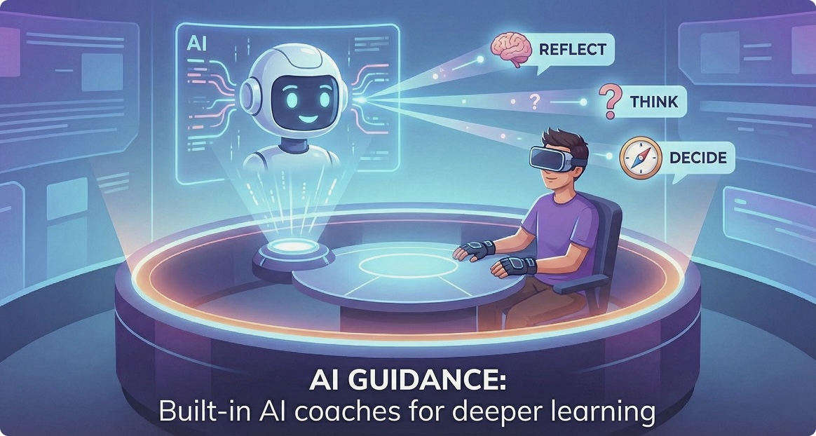 Built-in AI coaches students as they play, providing nudges, reflections, and tailored suggestions. It supports deeper self-awareness, critical thinking, and intentional decision-making.
