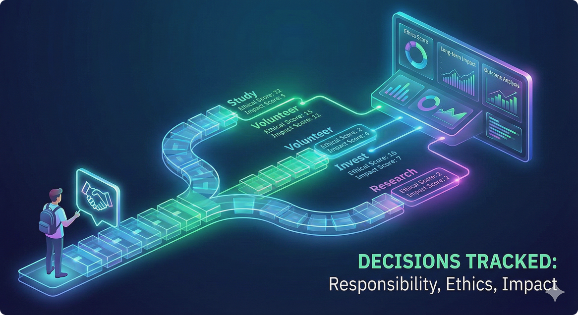 Every choice—small or big—is recorded and analyzed.This gives students a clear view of how decisions shape outcomes, helping them understand responsibility, ethics, and long-term impact.