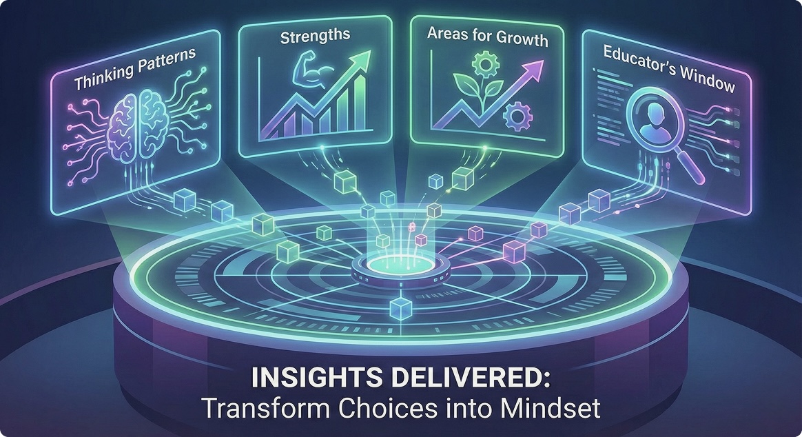 The system automatically transforms student choices into rich insights, highlighting thinking patterns, strengths, and areas for growth. Educators get an instant window into each learner’s mindset.